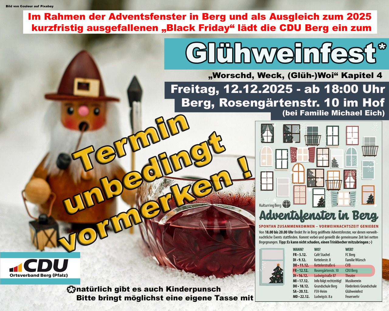 Wichtiger Hinweis: Bitte bringt zum Glühweinfest aus logistischen Gründen